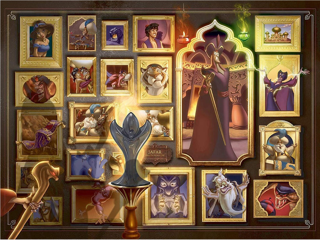 This dramatic puzzle stars the evil Jafar and echoes the game elements and style of the hit game Villainous. Discover a great art gallery filled with important Aladdin movie characters including Jasmine, Genie, Rajah, Iago, the Sultan, Aladdin and, of course, Jafar himself.