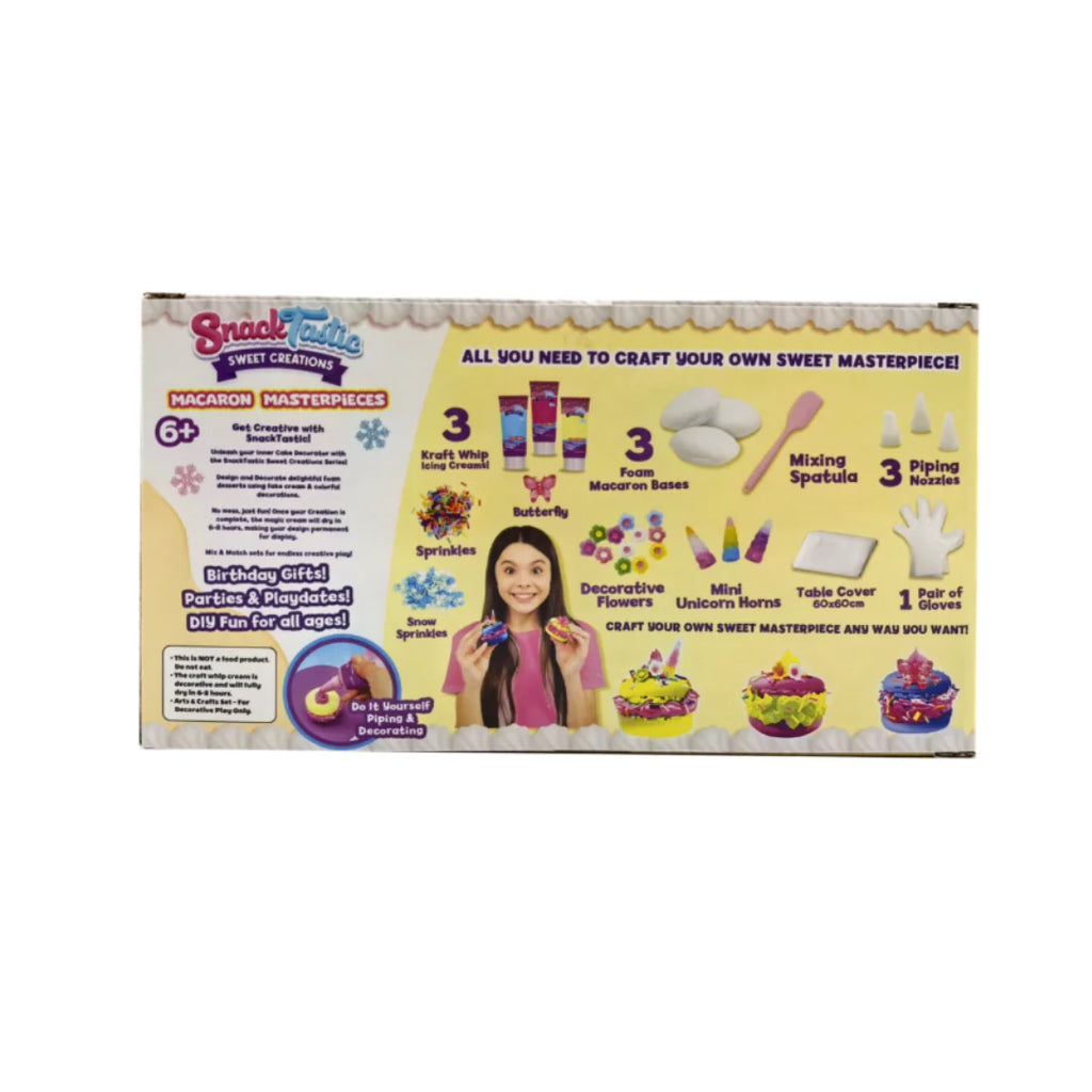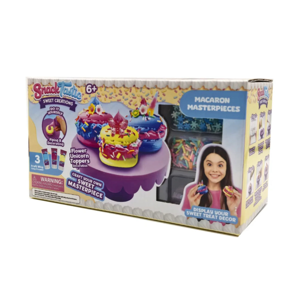 Snack Tastic – Macaron Masterpieces, an exciting DIY macaron decorating kit designed for kids who love hands-on activities. This playful set lets young creators decorate their own macarons using colorful toppers, sprinkles, icings, and a stylish display stand.
