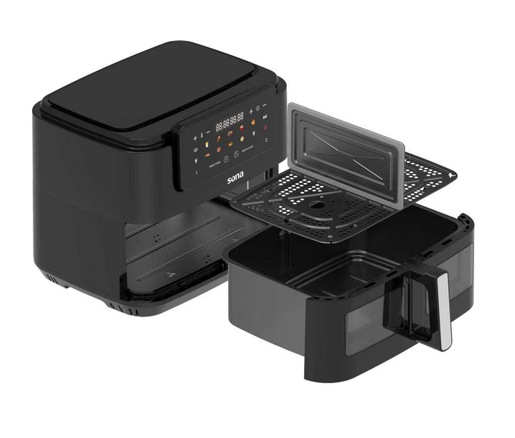 The Sona 10L Air Fryer combines substantial capacity with powerful 2600W performance, engineered for consistent, restaurant-quality results. Its transparent divider compartment enables versatile meal preparation—cook proteins and vegetables simultaneously while maintaining distinct flavors and textures. The expansive 10-liter chamber accommodates larger batches, reducing cooking time for busy households. Advanced air circulation technology ensures even heat distribution and optimal crispness with minimal oil dependency. Finished in sophisticated black, this unit integrates seamlessly into contemporary kitchens while delivering professional-grade functionality for everyday cooking demands.