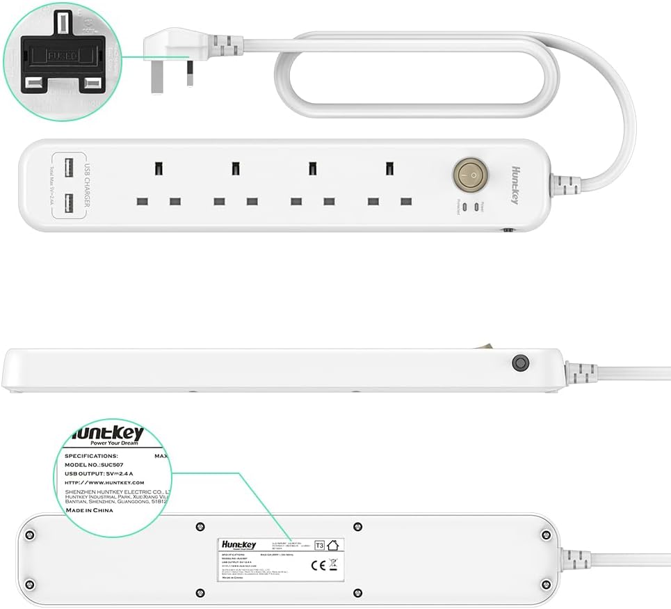 Experience reliable power connection and protection with the Huntkey SUC507 Power Strip. Equipped with 4 AC outlets, 2 USB charging ports, and a 6-in-1 extension cord with a UK plug, it’s perfect for home, office, and travel.