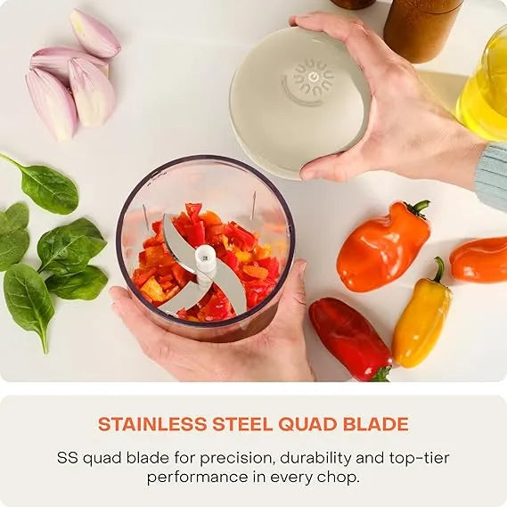 Experience effortless food prep with the Nutricook Choppi 500ML Desert Sand. This cordless electric vegetable chopper and mini food processor make dicing, shredding, mincing, and pureeing a breeze. With a 2-cup capacity and 4000 mAh battery, it's portable and rechargeable for on-the-go use. Say goodbye to tedious chopping and hello to quick and easy meal prep!