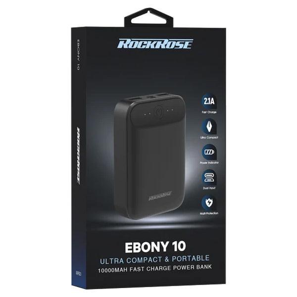 Keep your devices charged anywhere with the RockRose Ebony 10. This compact yet powerful power bank features a 10000mAh capacity, dual input and output ports, and fast 2.1A charging, making it the ideal choice for users on the go.
