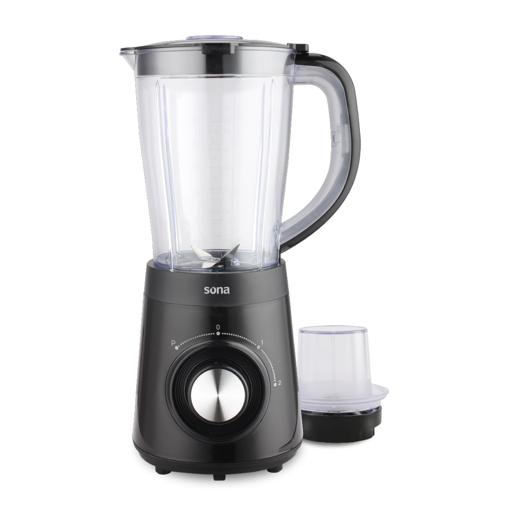 Sona 500W Blender with Grinder 1.5L – Black The Sona 500W Blender combines powerful performance with versatile functionality. Its robust 500W motor efficiently handles smoothies, soups, sauces, and frozen beverages, while the integrated grinder attachment tackles nuts, seeds, and spices with precision. The 1.5L capacity accommodates family-sized portions, making it ideal for meal preparation and batch processing. The sleek black finish complements modern kitchens, and the durable construction ensures reliable daily use. Perfect for health-conscious households seeking a multi-functional appliance that delivers consistent results without compromising on power or capacity.