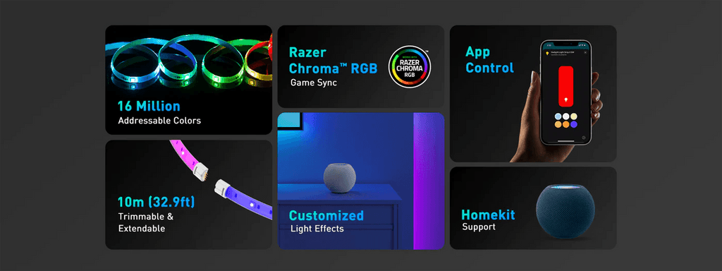 -Flexible stripes provide flexible length. The LED strip Pro can be freely trimmed* or extended to 10m (32.9ft).
